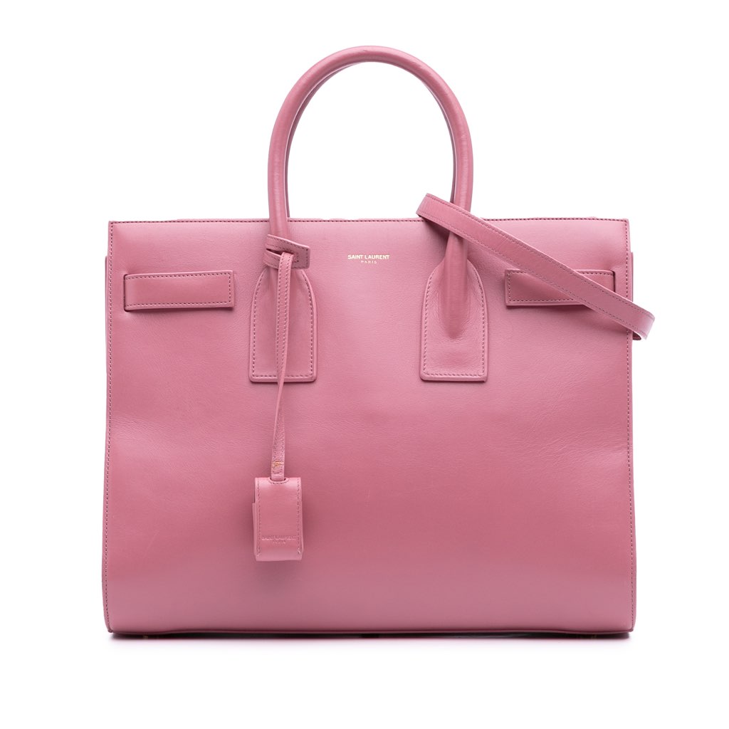 The Sac de Jour features a leather body, rolled leather handles, a detachable flat leather strap, an open top, an interior zip compartment, and interior slip pockets.