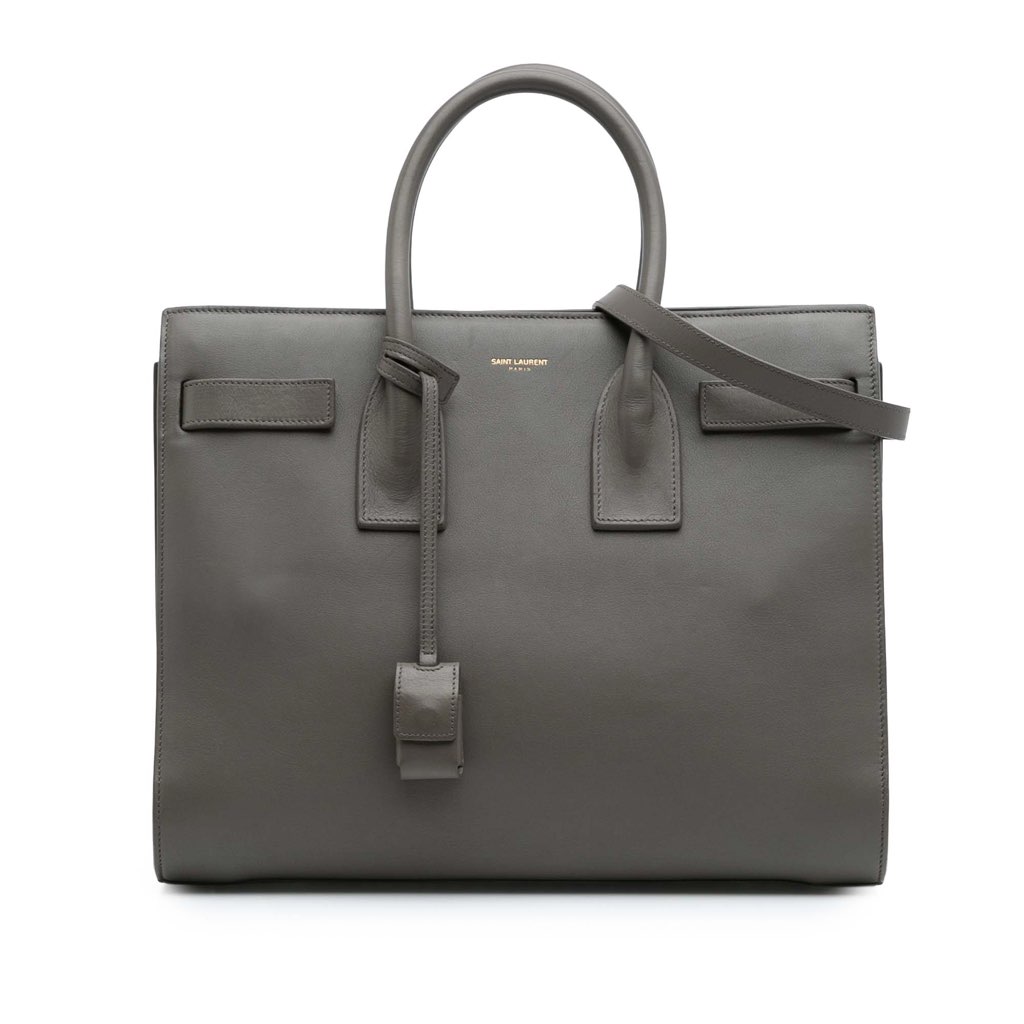 The Sac De Jour features a leather body, rolled leather handles, a detachable flat strap, an open top, an interior zip compartment, and interior zip and slip pockets.