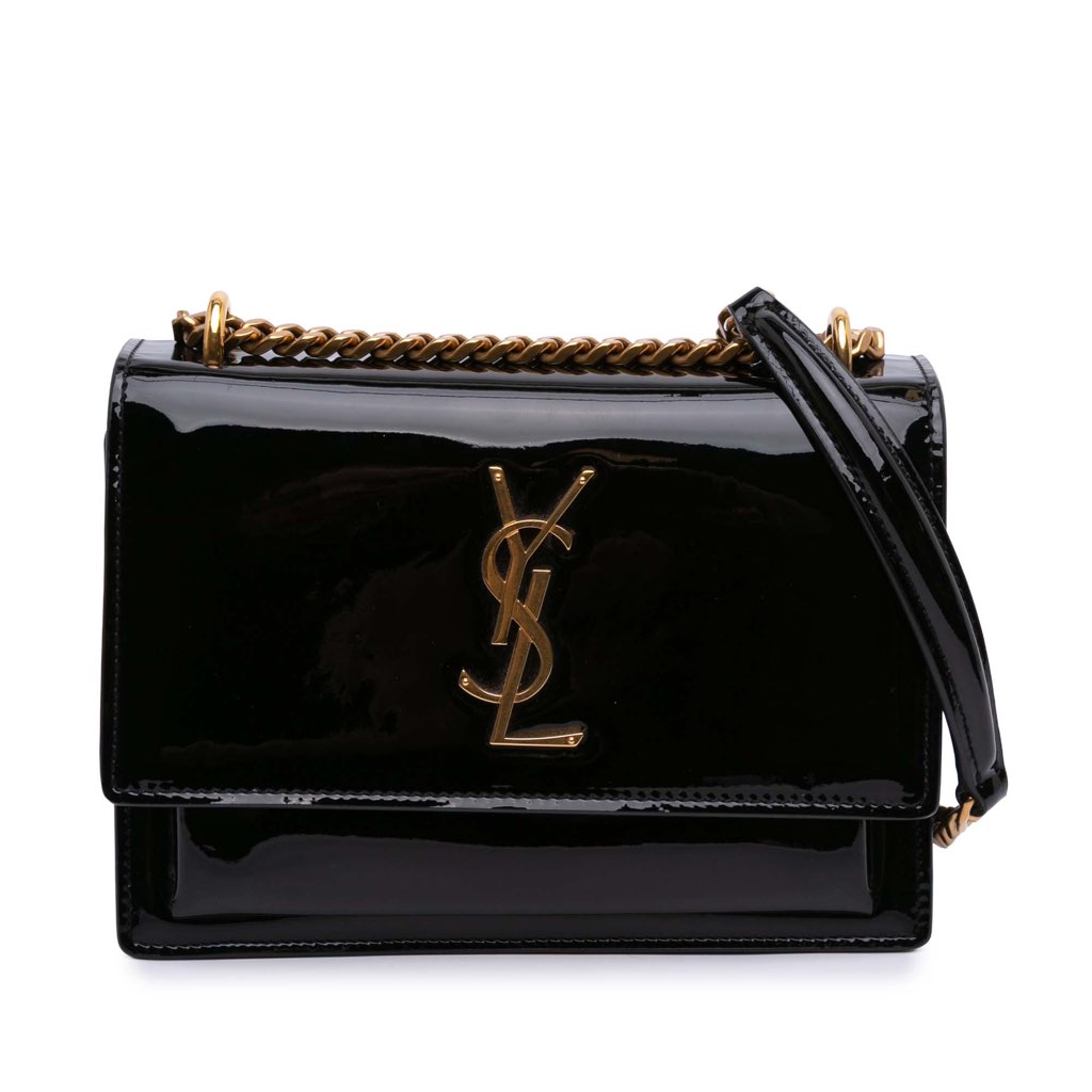 The Sunset features a patent leather body, a chain link strap with leather guard, a top flap with magnetic snap button closure, and an interior slip pocket.
