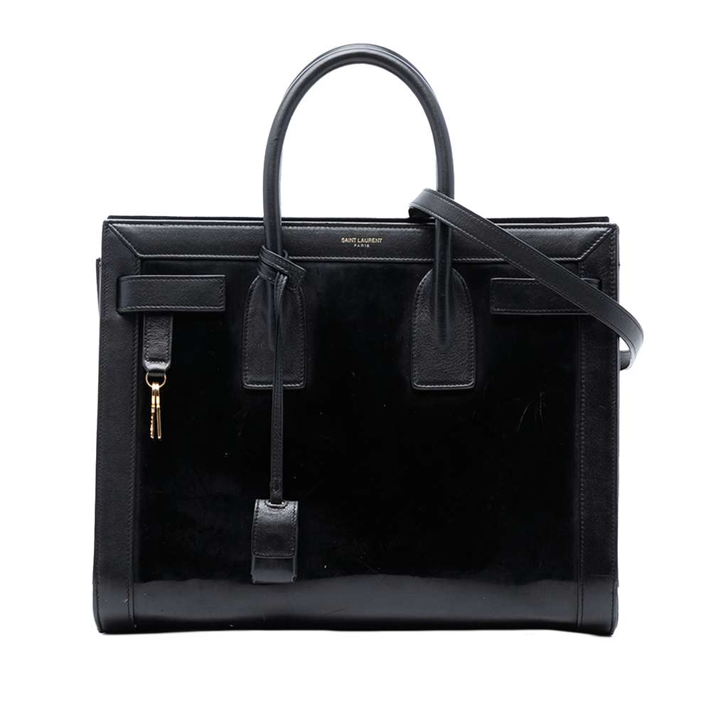 The Sac De Jour features a patent leather body, rolled leather handles, a detachable flat strap, an open top, an interior zip compartment, and interior zip and slip pockets.
