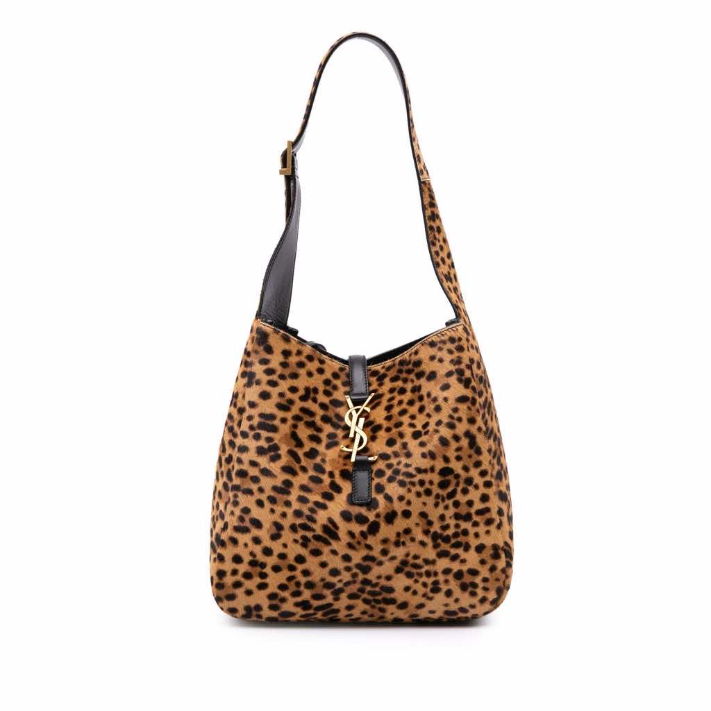 The Le 5 a 7 features a printed pony hair body, an adjustable flat shoulder strap, an open top with a flat leather strap pull-through closure, and an interior zip pocket.