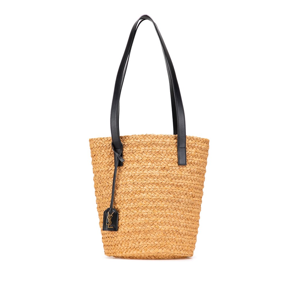 This tote bag features a raffia body, flat leather handles, an open top, and an interior zip pocket.