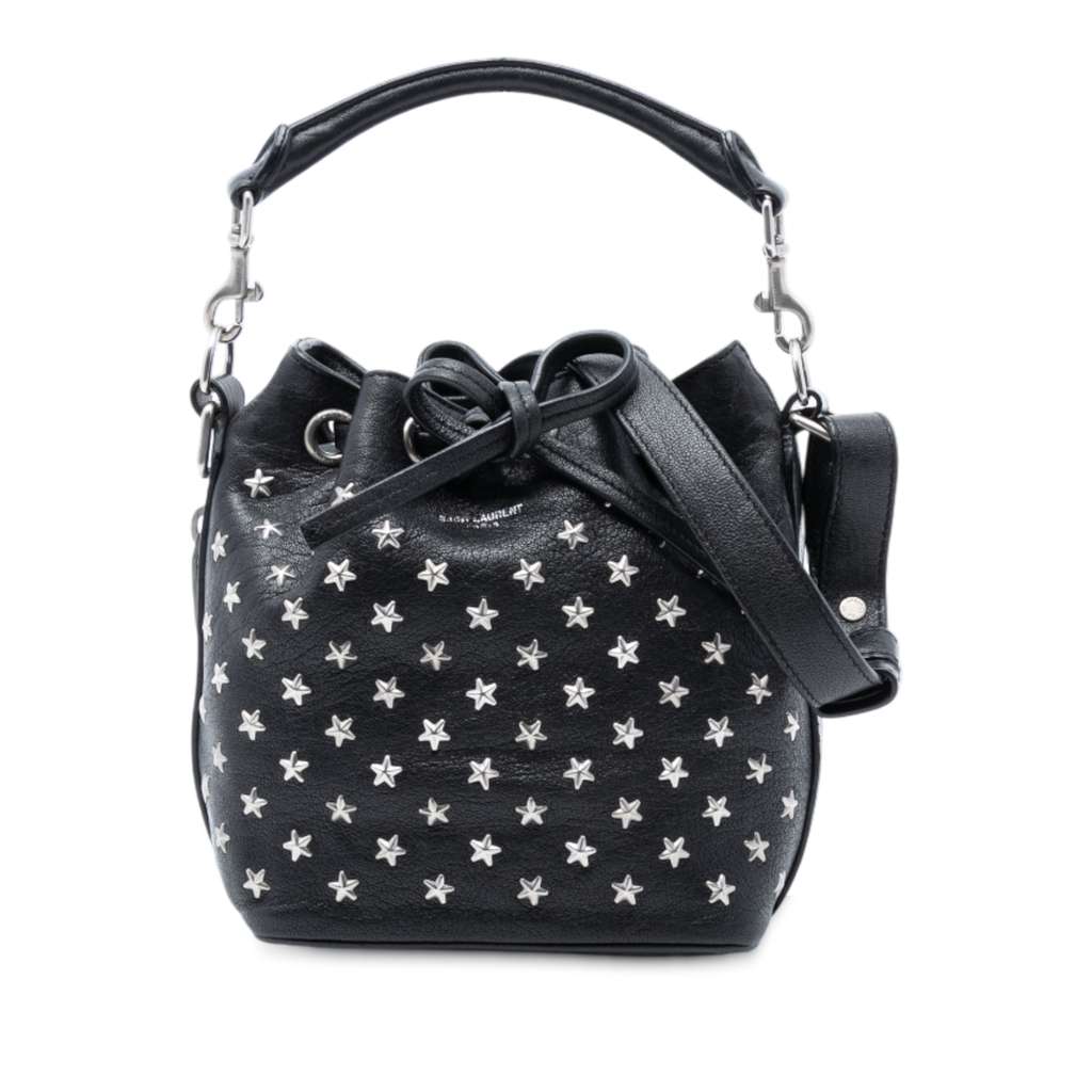 The Emmanuelle features a star studded leather body, a detachable rolled leather top handle, an adjustable flat leather shoulder strap, and an open top with drawstring closure.