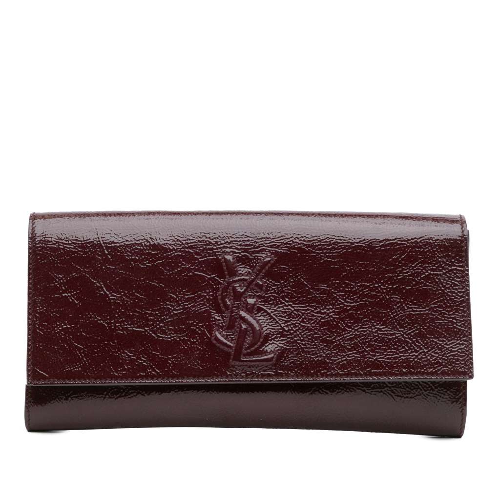 The Belle De Jour clutch bag features a patent leather body, a flap with magnetic snap closure, and an interior slip pocket.