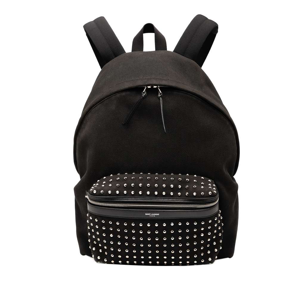 The City backpack features a studded canvas body with leather trim, a flat top handle, flat back straps, a top zip closure, an exterior front zip pocket, and interior zip and slip pockets.