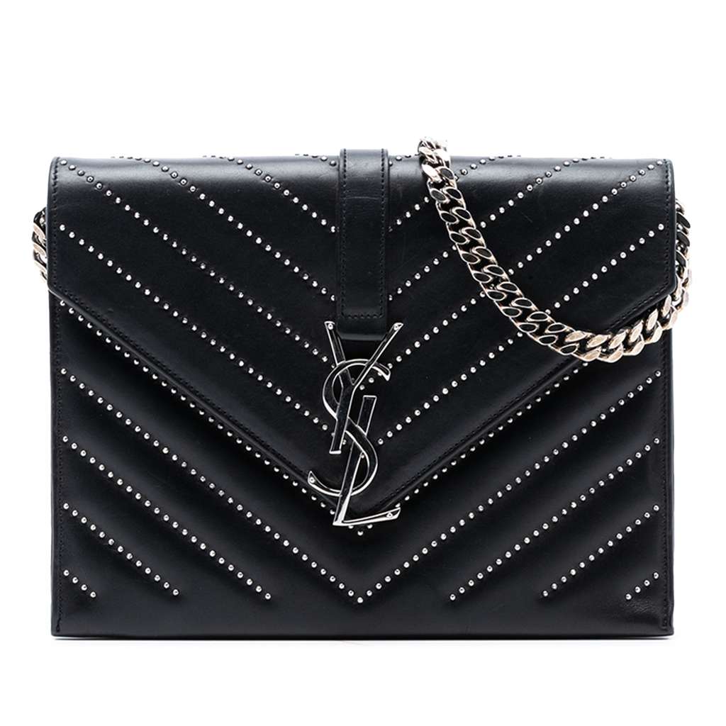 This crossbody bag features a studded leather body, a chain link shoulder strap, a front flap with magnetic snap closure, and an interior open compartment with card slots.