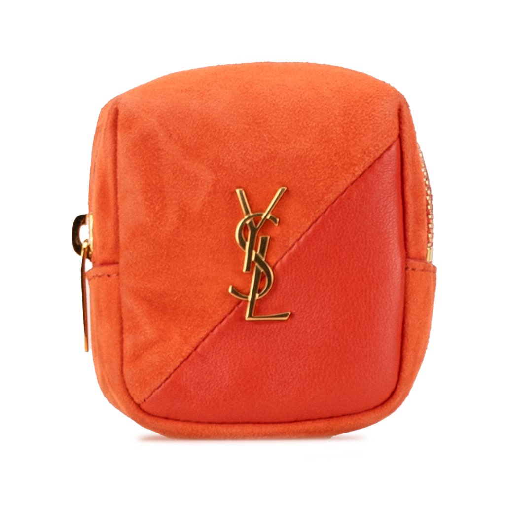 This coin pouch features a suede and calfskin body and a zip around closure.