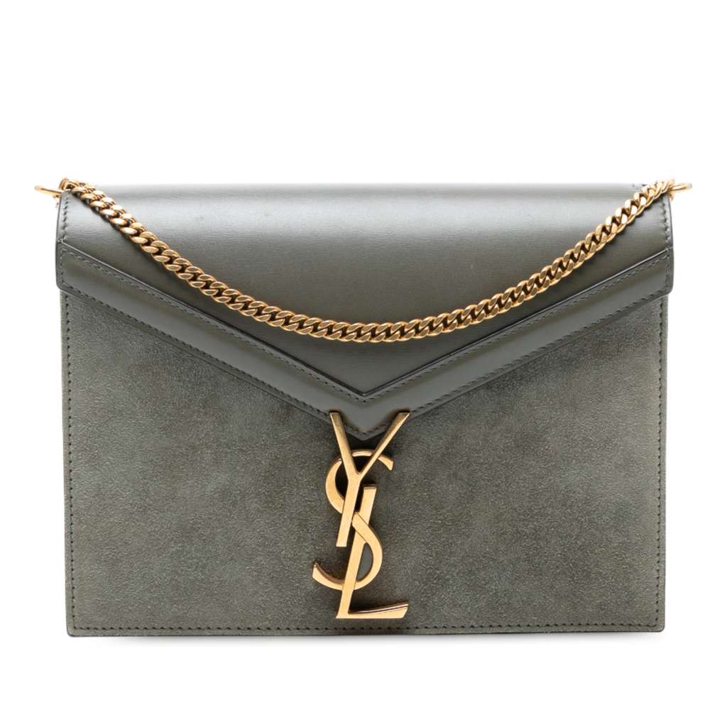 The Cassandra features a suede and calf leather body, a gold-tone chain link strap, front flap with metal YSL logo and magnetic closure, and an interior zip pocket.