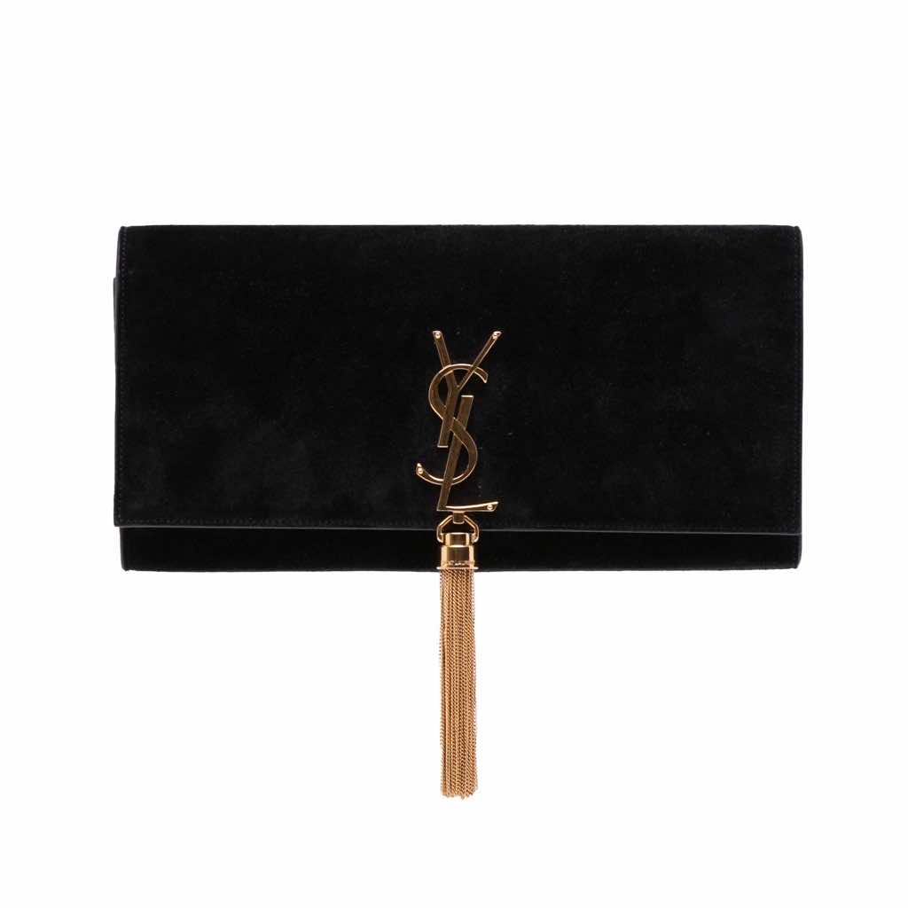 This clutch features a suede leather body, a front flap with magnetic snap closure, and an interior slip pocket.