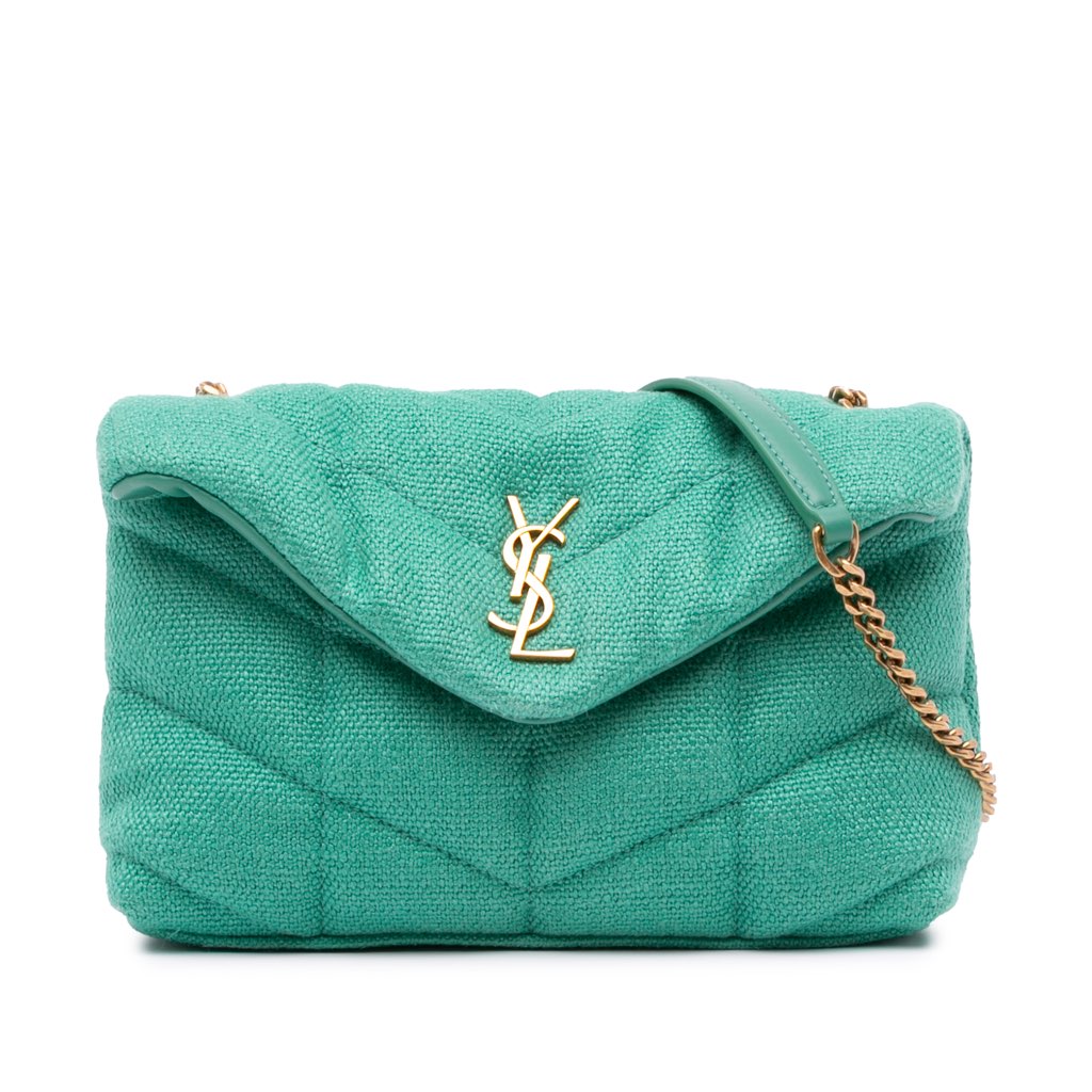 The LouLou Puffer features a quilted canvas body, a curb chain straps with leather shoulder guard, a front flap with a magnetic snap button closure, and an interior zip pocket.