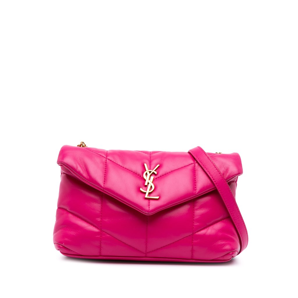 The LouLou Puffer features a quilted lambskin leather body, a chain link strap with leather guard, a front flap with magnetic snap closure, and an interior zip pocket.