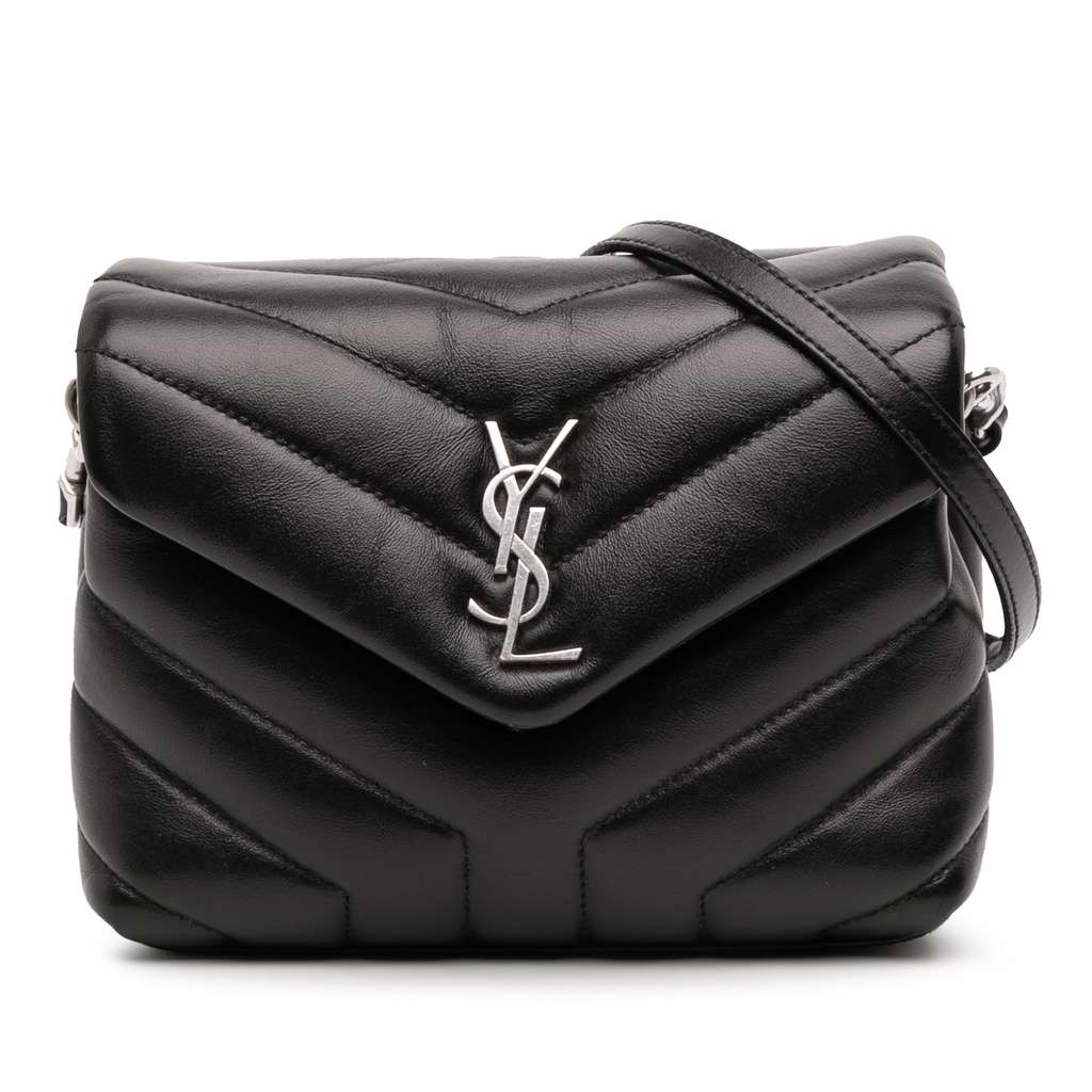 The Toy Loulou crossbody bag features a leather body, a detachable flat leather shoulder strap, a front flap with magnetic snap closure, and interior zip and slip pockets.