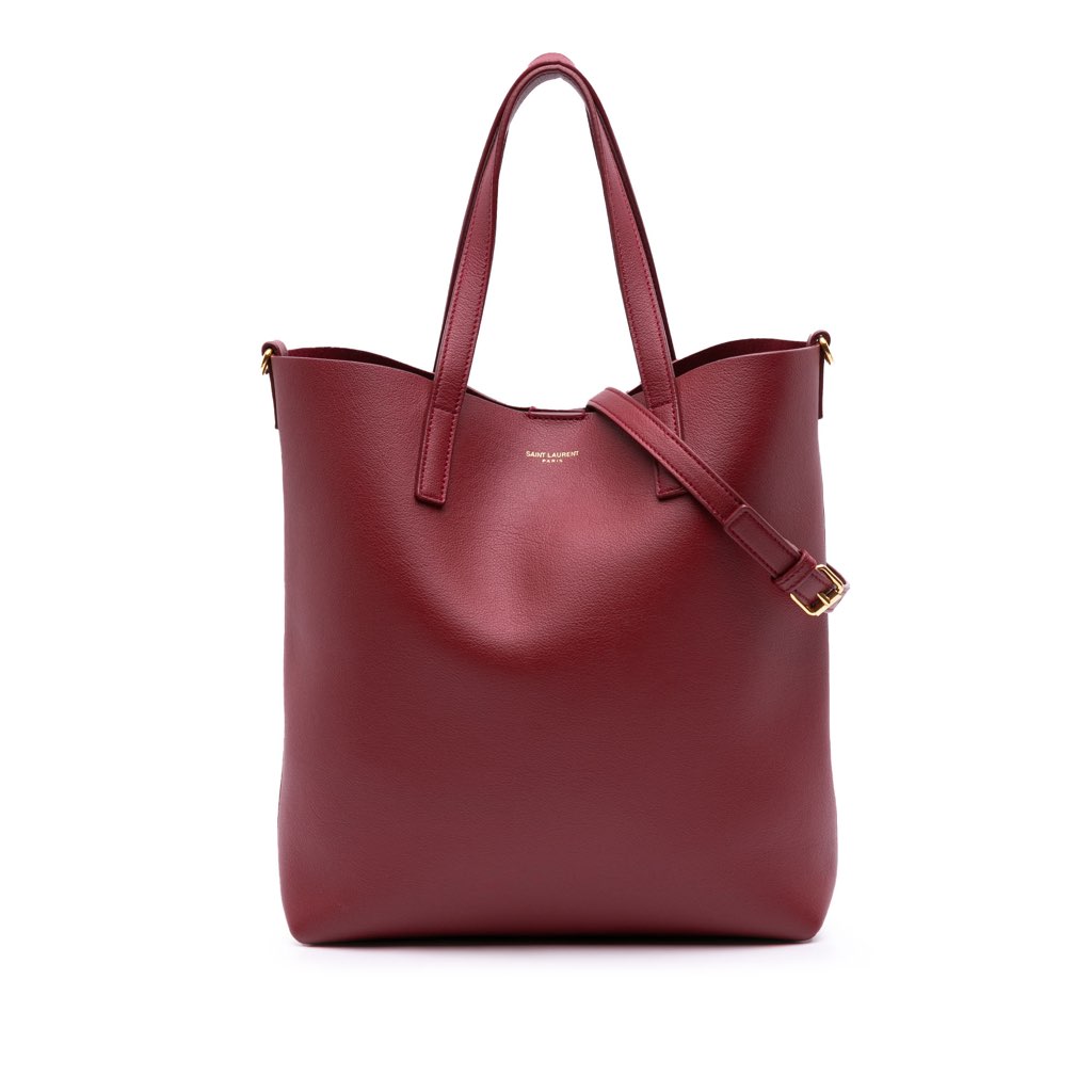 This satchel features a leather body, flat leather handles, a detachable flat leather strap, and an open top with magnetic closure.