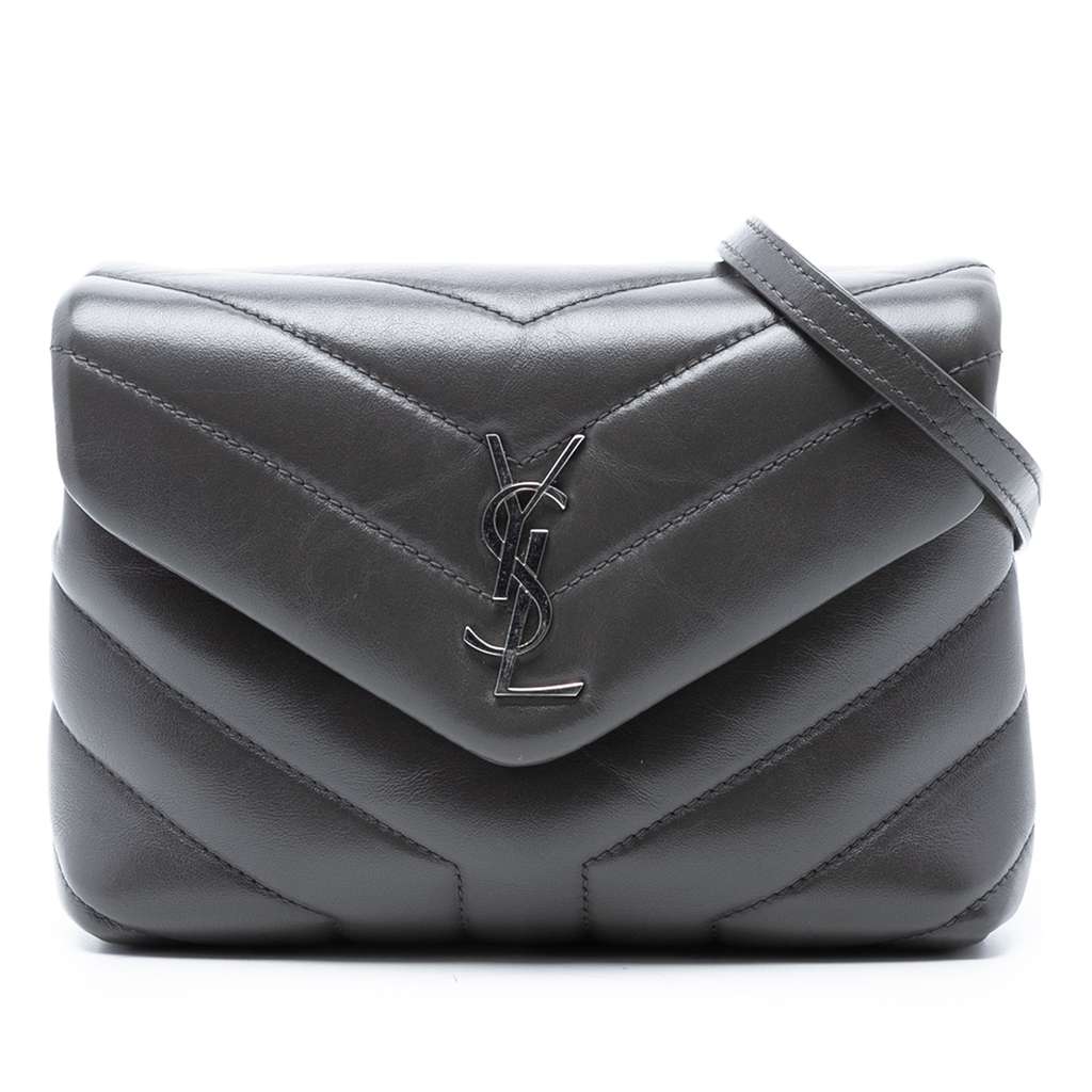 The Toy Loulou crossbody bag features a quilted leather body, a detachable flat leather shoulder strap, a front flap with magnetic snap closure, and interior zip and slip pockets.