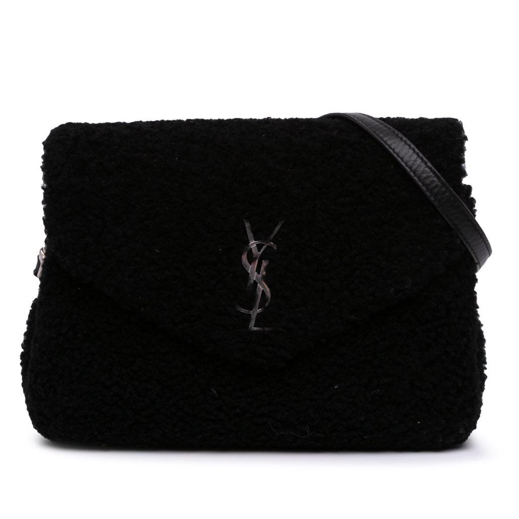 This crossbody bag features a fur body, a detachable and adjustable flat leather strap, a front flap with magnetic snap closure, interior zip and slip pockets.
