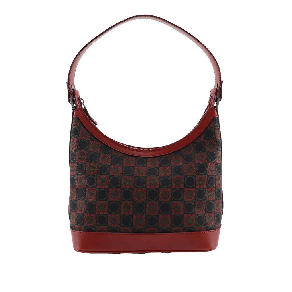 This shoulder bag features canvas body with leather trim, a flat leather strap, a top zip closure and an interior zip pocket.