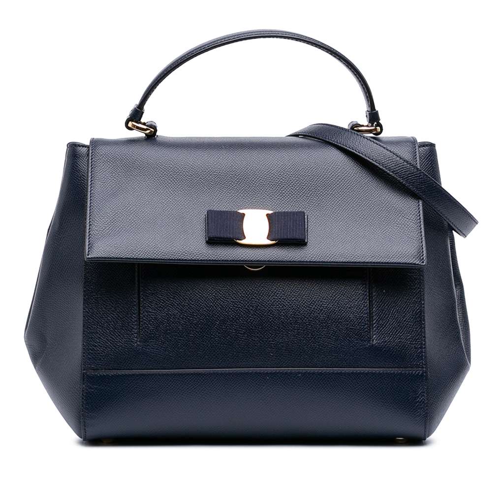 This satchel features a leather body, flat leather top handle, a flat leather strap, a front flap with magnetic snap closure, and an interior zip pocket.