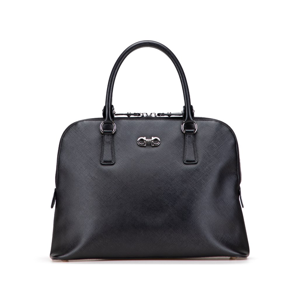 This handbag features a leather body, rolled leather handles, a top zip around closure, and interior pockets.