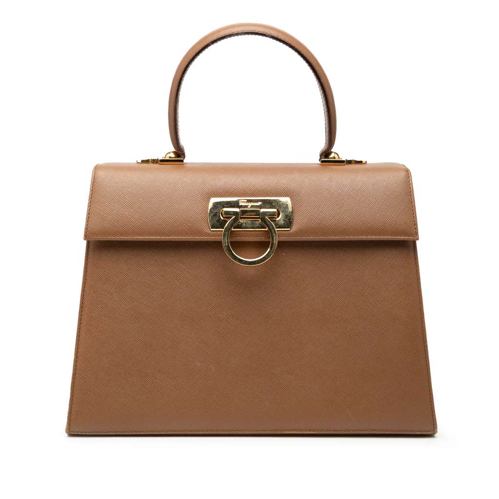 This satchel features a leather body, a flat top handle, a front flap with flip lock closure, and an interior zip pocket.