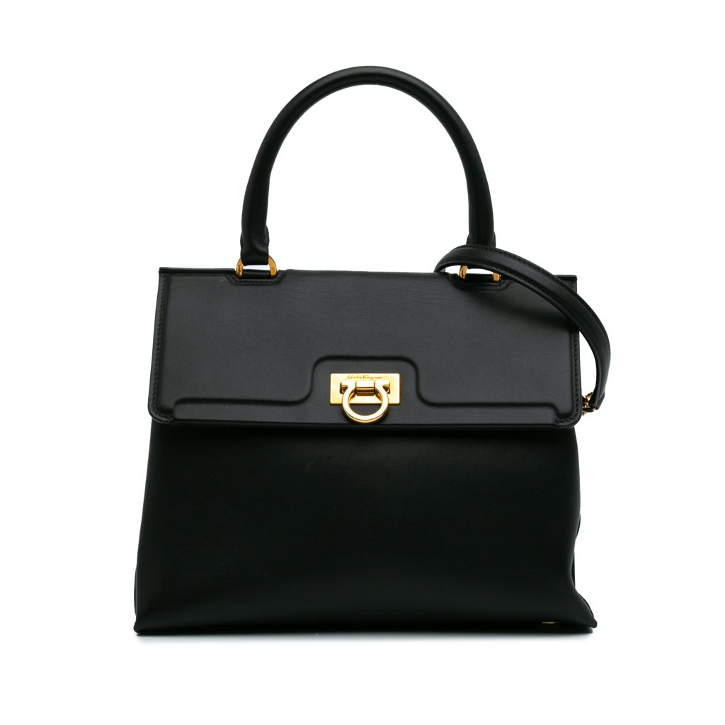 This satchel features a leather body, a rolled leather top handle, a detachable chain link and flat leather shoulder strap, a front flap with a flip lock closure, an exterior back slip pocket, and interior slip pockets.