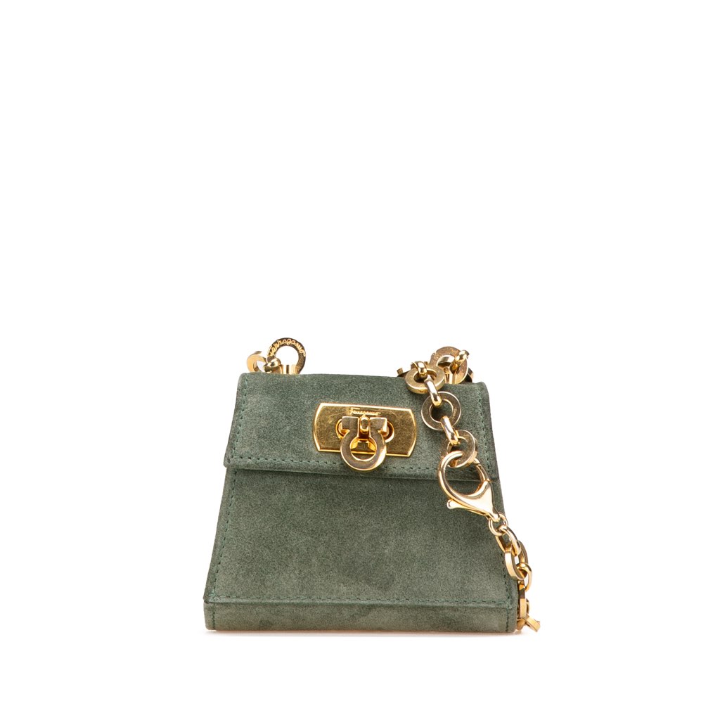 This crossbody bag features a suede body, a chain link strap, and a flap with flip lock closure.