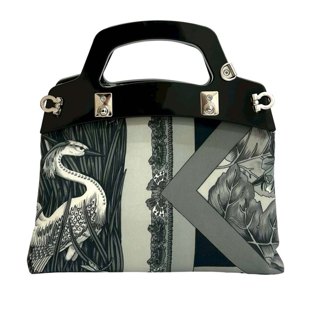 This satchel bag features a canvas body, acrylic top handles, a detachable flat leather strap, top magnetic snap button closure, and an interior zip pocket.