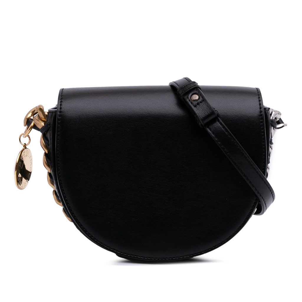 The Frayme crossbody bag features a faux leather body with chain details, a flat leather shoulder strap, a flap with magnetic snap closure, and an interior slip pocket.