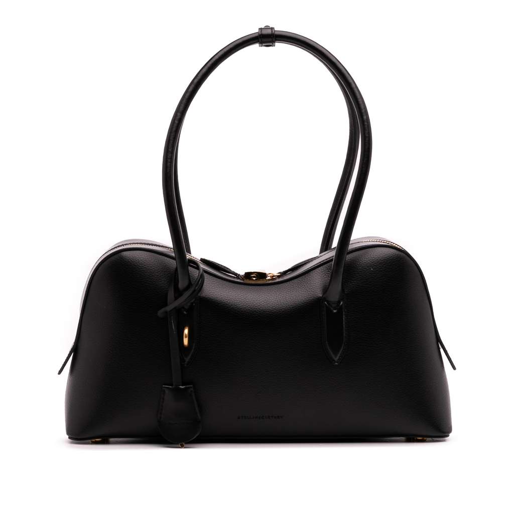 This shoulder bag features a vegan leather body, rolled top handles, a top zip closure, and an interior slip pocket.