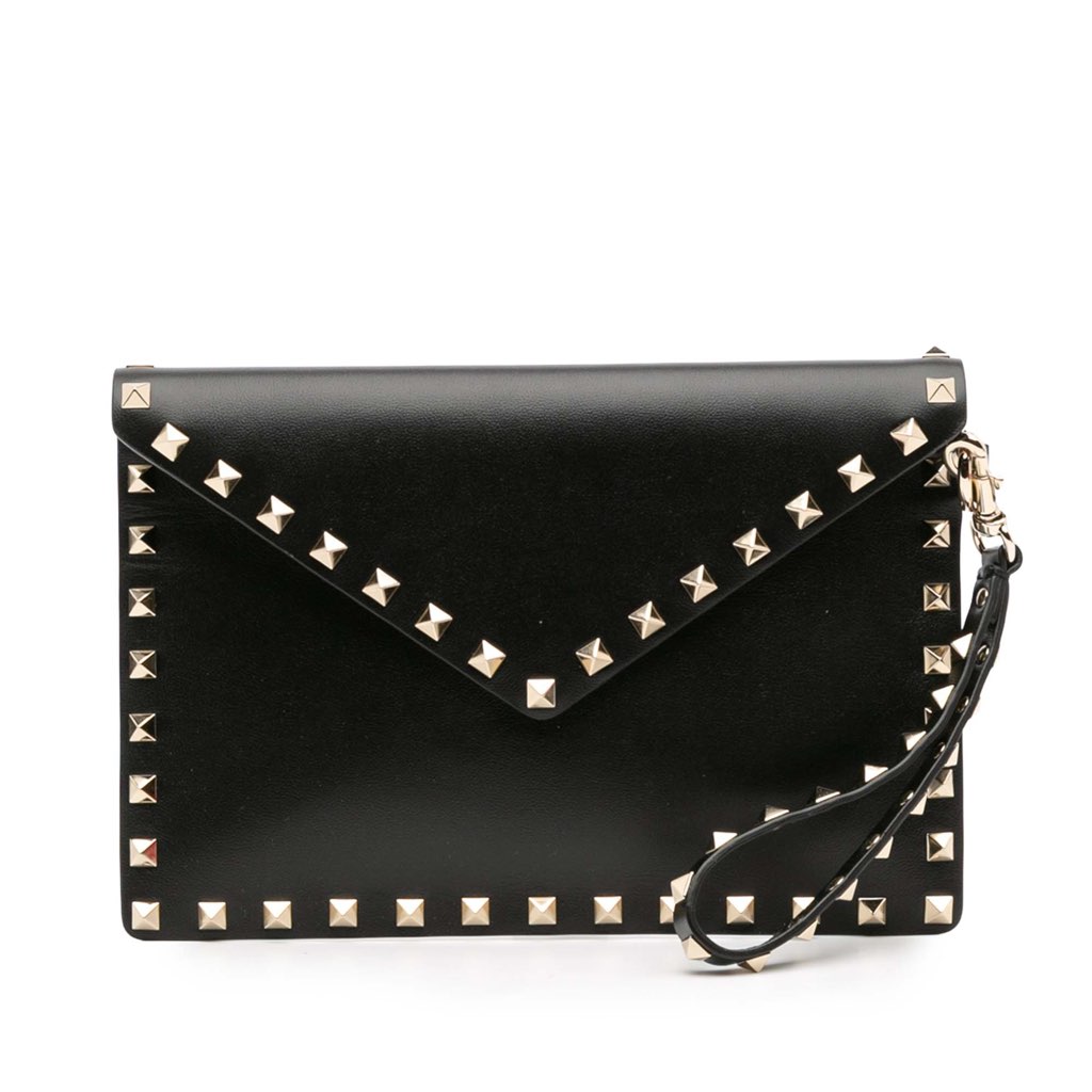 This clutch features a leather body with stud embellishments, a detachable studded leather wrist strap, a front flap with magnetic snap closure, and interior card slots.