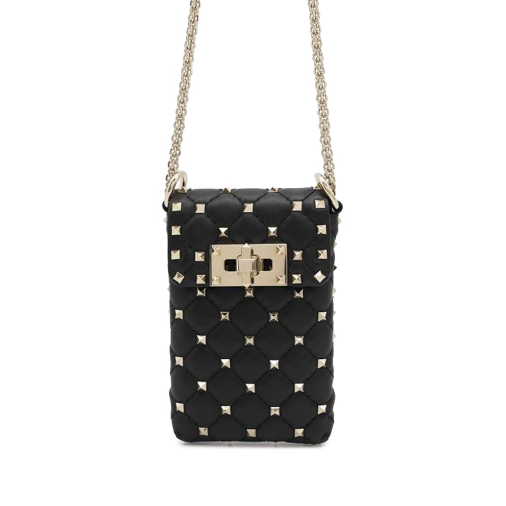 This phone case crossbody features a studded leather body, a detachable chain link strap, a flap with turn lock closure, and interior slip pockets.