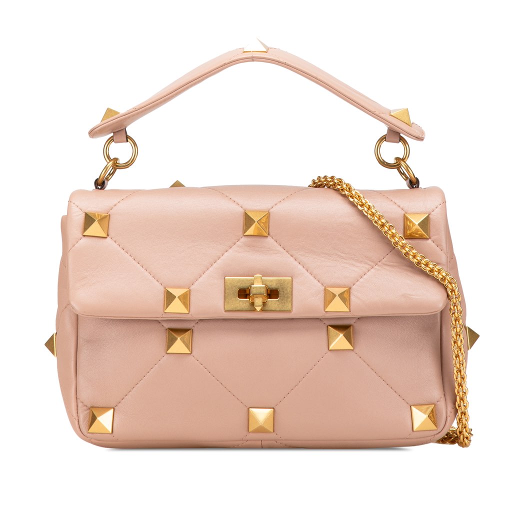 This satchel features a studded and quilted nappa leather body, a flat leather handle, a removable gold-tone chain link shoulder strap, a front flap with twist lock closure, and interior zip and slip pockets.