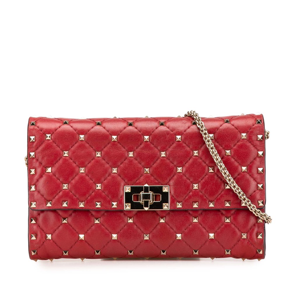 This wallet on chain features a quilted leather body with studs, a chain link shoulder strap, a front flap with twist lock closure, and interior zip and slip pockets.