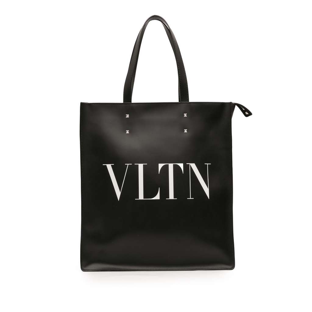 The VLTN tote features a leather body, flat straps, a top zip closure, and a zip pouch inclusion.