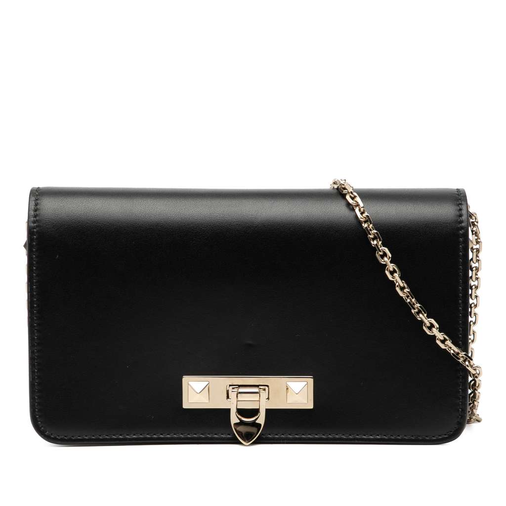 This wallet on chain features a leather body, a chain link strap, a front flap with flip lock closure, and interior slip pockets.