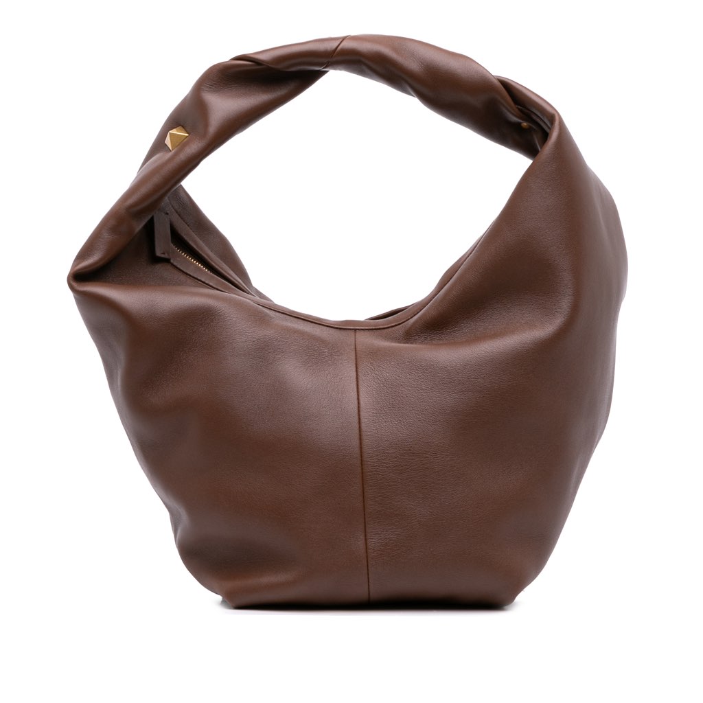 This hobo bag features a leather body, a flat shoulder strap, a top zip closure, and interior zip and slip pockets.