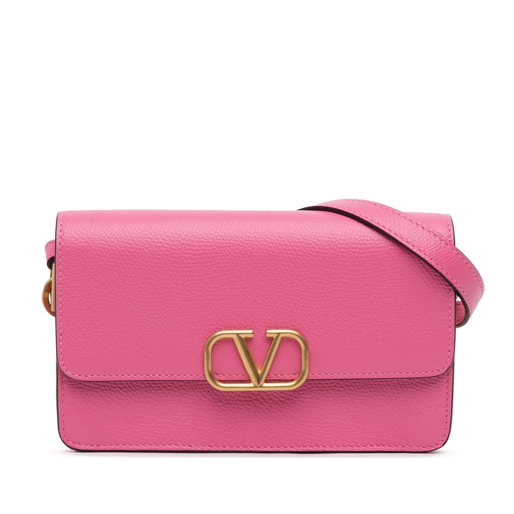 The Vlogo bag features a leather body, a detachable chain link handle with leather strap, a detachable and adjustable waist strap, a front flap with a magnetic snap closure, and an interior slip pocket.