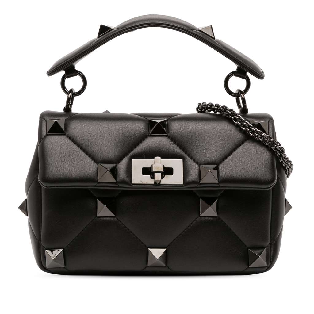 This satchel features a studded and quilted nappa leather body, a flat leather handle, a removable chain shoulder strap, a front flap with twist lock closure, and interior zip and slip pockets.