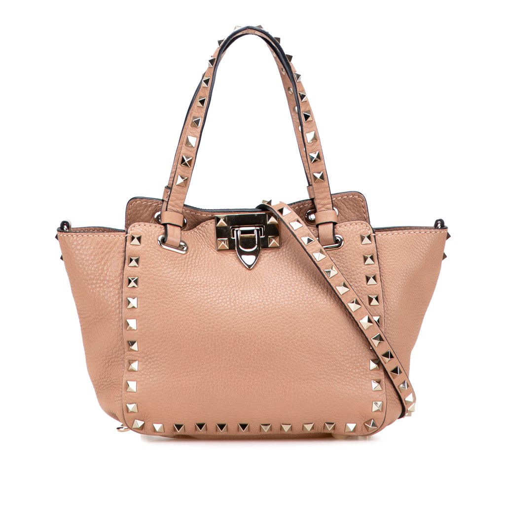 This satchel features a leather body with studs, flat leather handles with stud details, a detachable flat strap, a top flip lock closure, and an interior zip pocket.