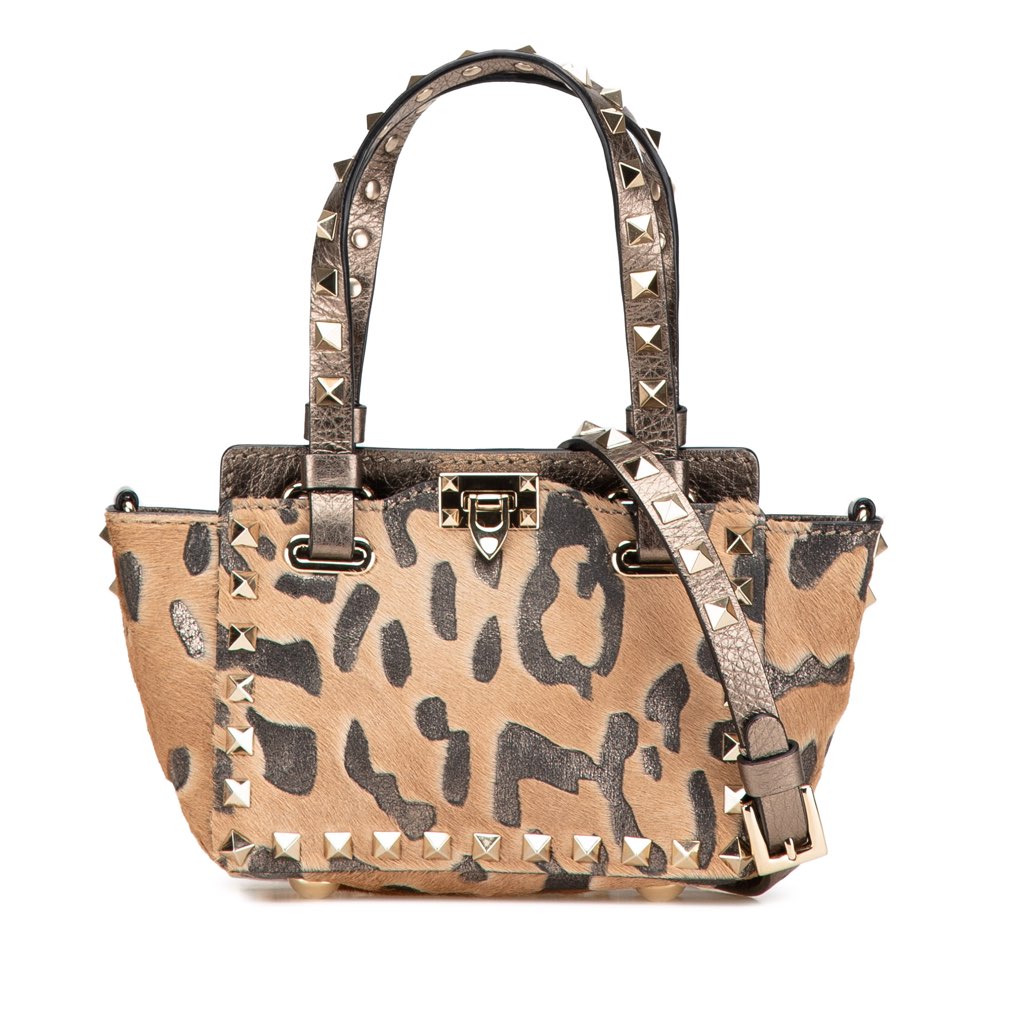 This satchel features a pony hair body with studs, flat studded leather handles, a detachable flat strap, and a top flip-lock closure.