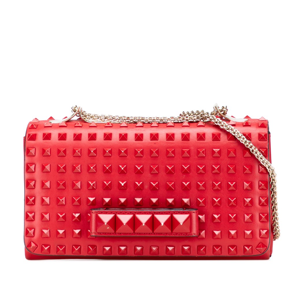 The Va Va Voom features a leather body with stud embellishments, a studded leather handle, a chain link shoulder strap, a front flap with magnetic snap closures, and an interior slip pocket.