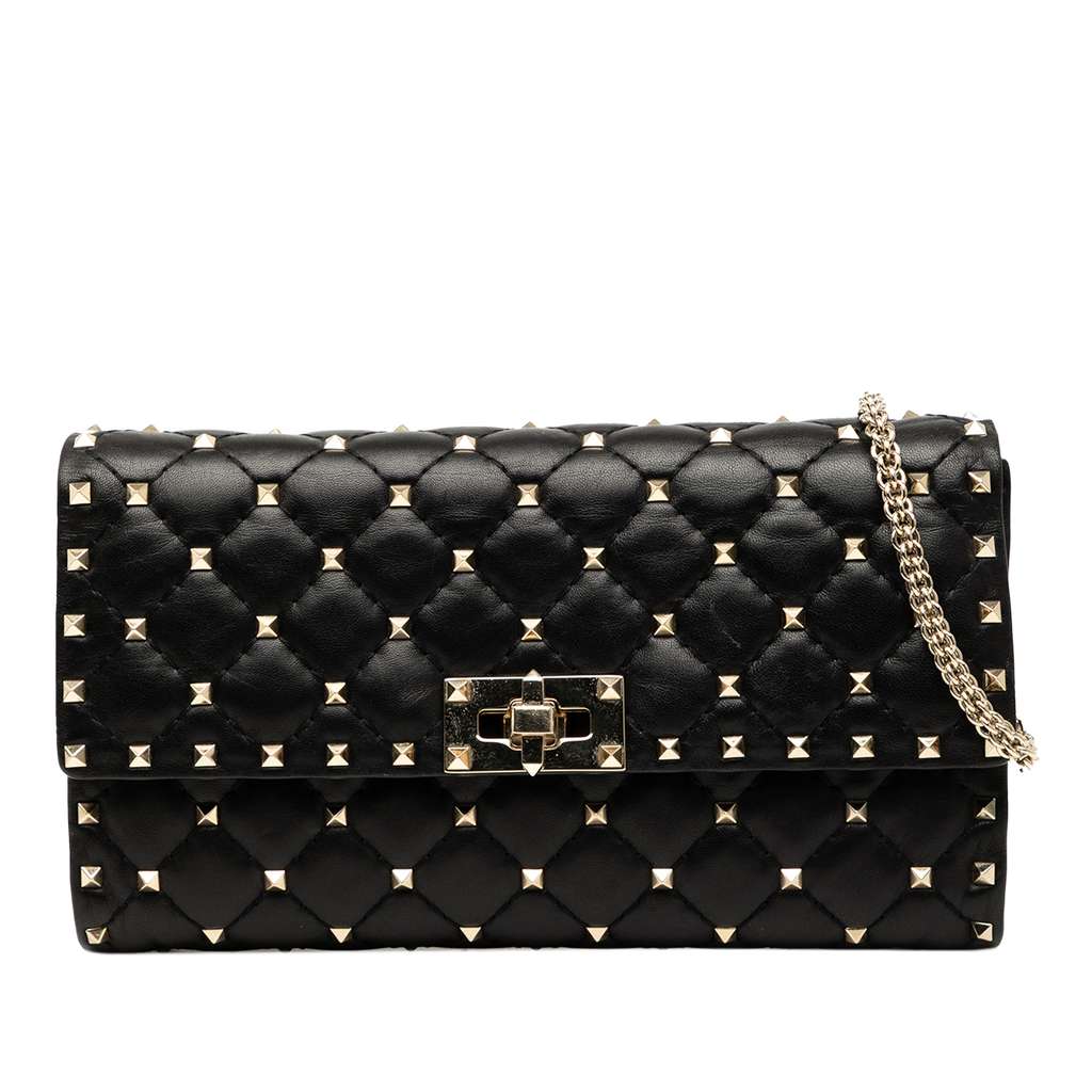 This wallet on chain features a quilted leather body with studs, a chain shoulder strap, a front flap with twist lock closure, and interior zip and slip pockets.