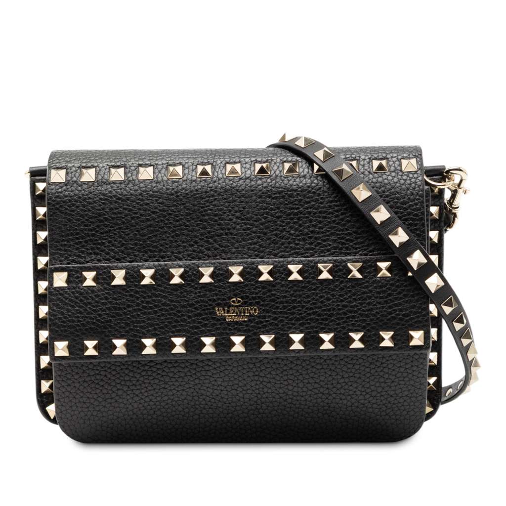 This crossbody bag features a leather body with stud details, a detachable flat leather strap, a front flap with a snap closure, and an interior zip pocket.