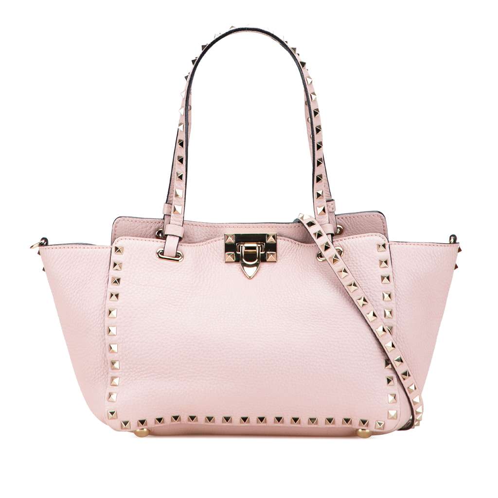 This satchel features a studded leather body, flat studded leather handles, a detachable strap, an open top with flip-lock closure, and an interior zip pocket.