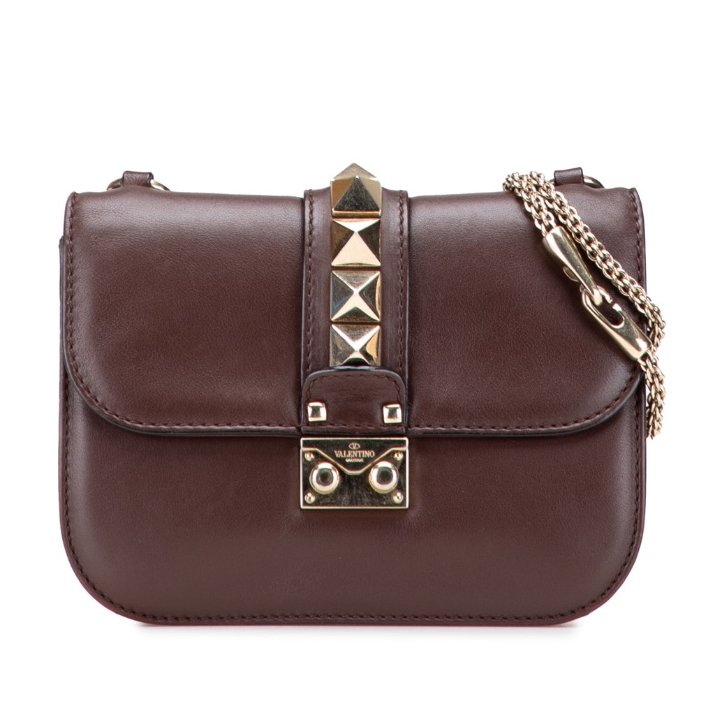 The Glam Lock crossbody features a leather body, a chain strap, a front flap with a push lock closure, and interior zip and slip pockets.