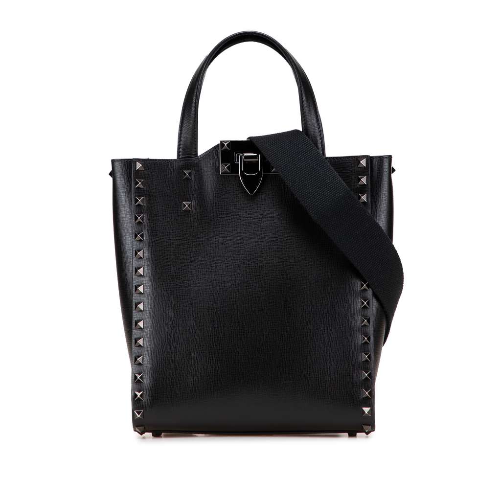 This satchel features a studded leather body, flat leather handles, a detachable canvas strap, a top flip lock closure, and an interior slip pocket.