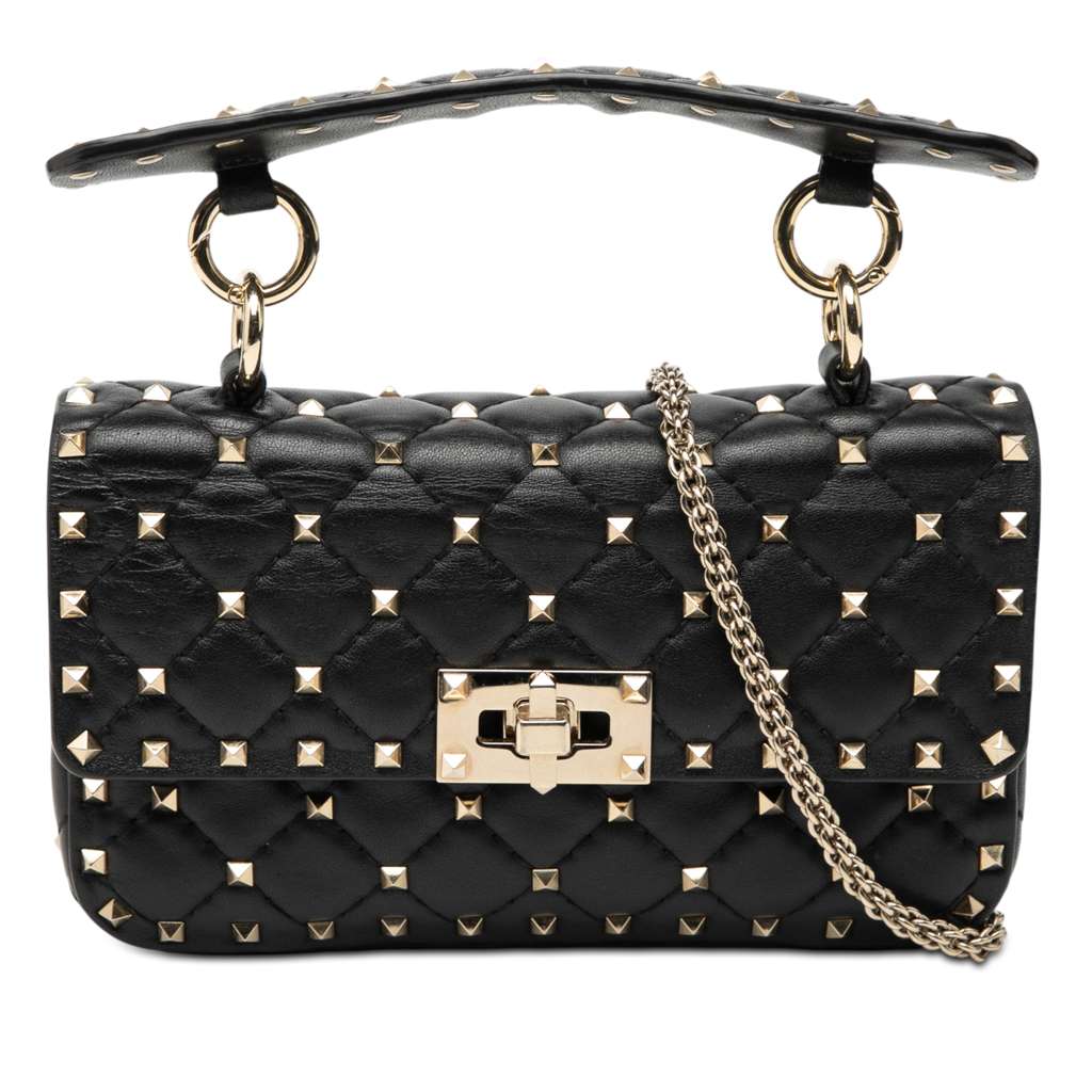 The Spike satchel features a quilted and studded nappa leather body, a flat leather top handle, a detachable chain strap, a front flap with a twist lock closure, and an interior slip pocket.