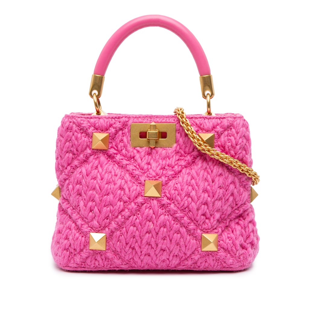 This satchel features a woven wool body with stud details, a rolled leather handle, a detachable chain strap, an open top partitioned with twist lock closure and magnetic snap closure, and an interior slip pocket.