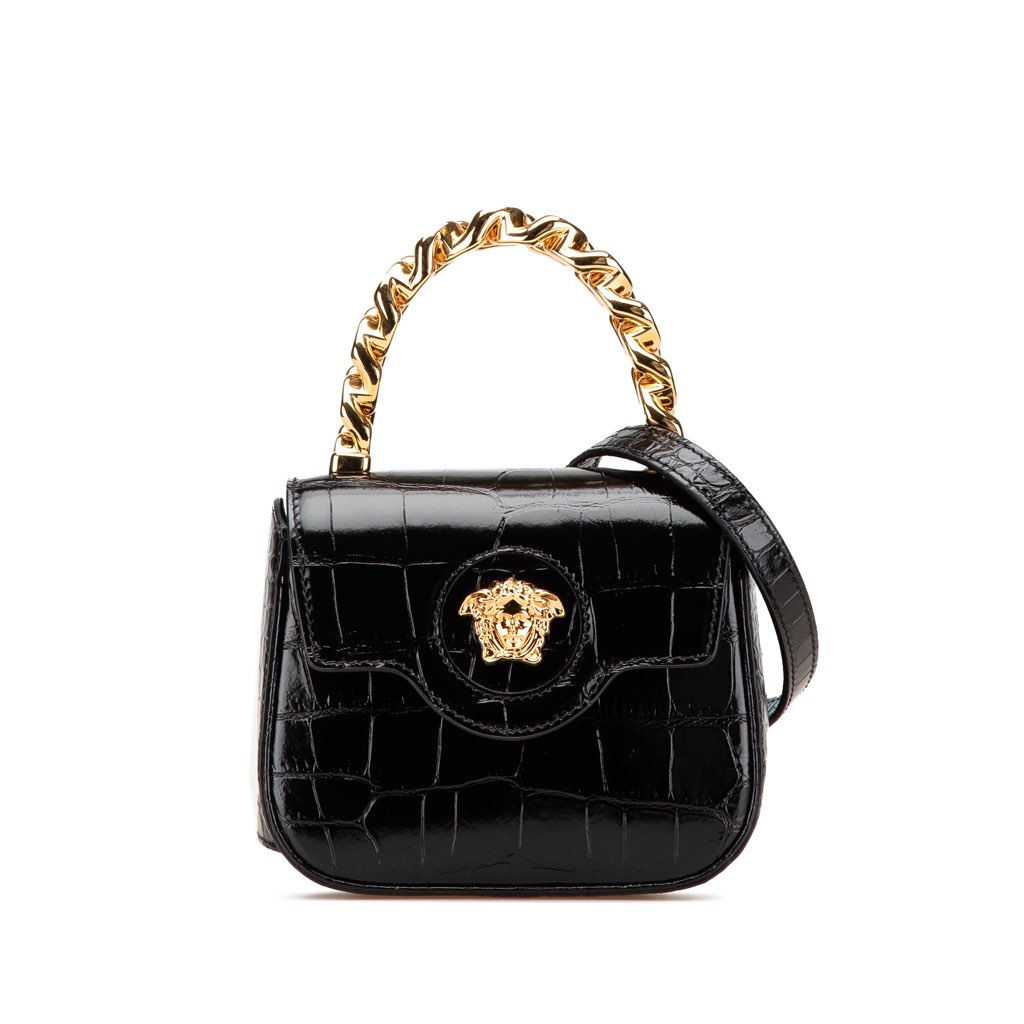 The La Medusa satchel features a croc embossed leather body, a metal top handle, an adjustable flat leather shoulder strap, a front flap with metal hardware and magnetic snap closure, and interior card slots.