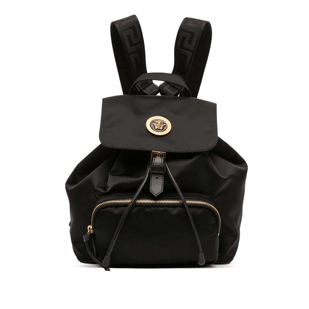 This backpack features a nylon body, a flat top handle, adjustable flat back straps, a front flap with buckle detail and magnetic snap closure, an open top with drawstring closure, and an exterior front zip compartment.