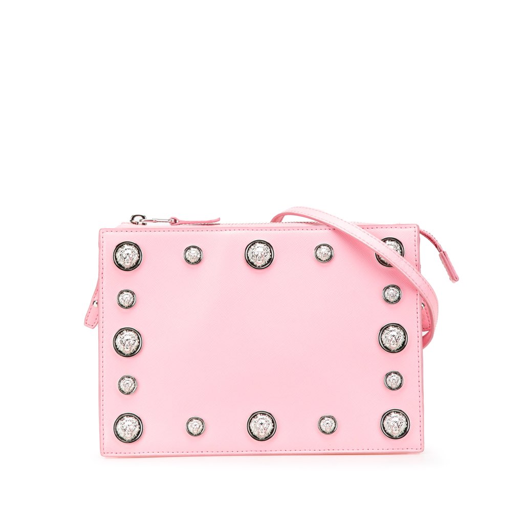 This crossbody bag features a leather body with lion head stud details, a flat leather strap, a top zip closure, and an interior slip pocket.
